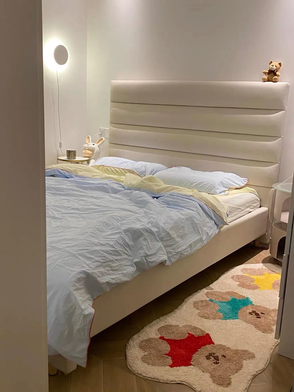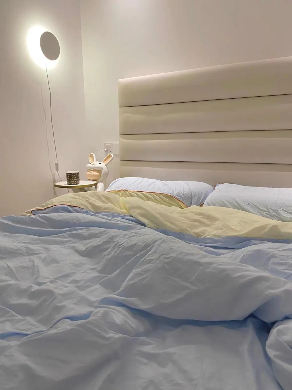 Let the color block design stand out by avoiding excessive layering. Add a single cream pillow for balance. Keep surfaces clean and uncluttered. Perfect for a Korean minimal bedroom.