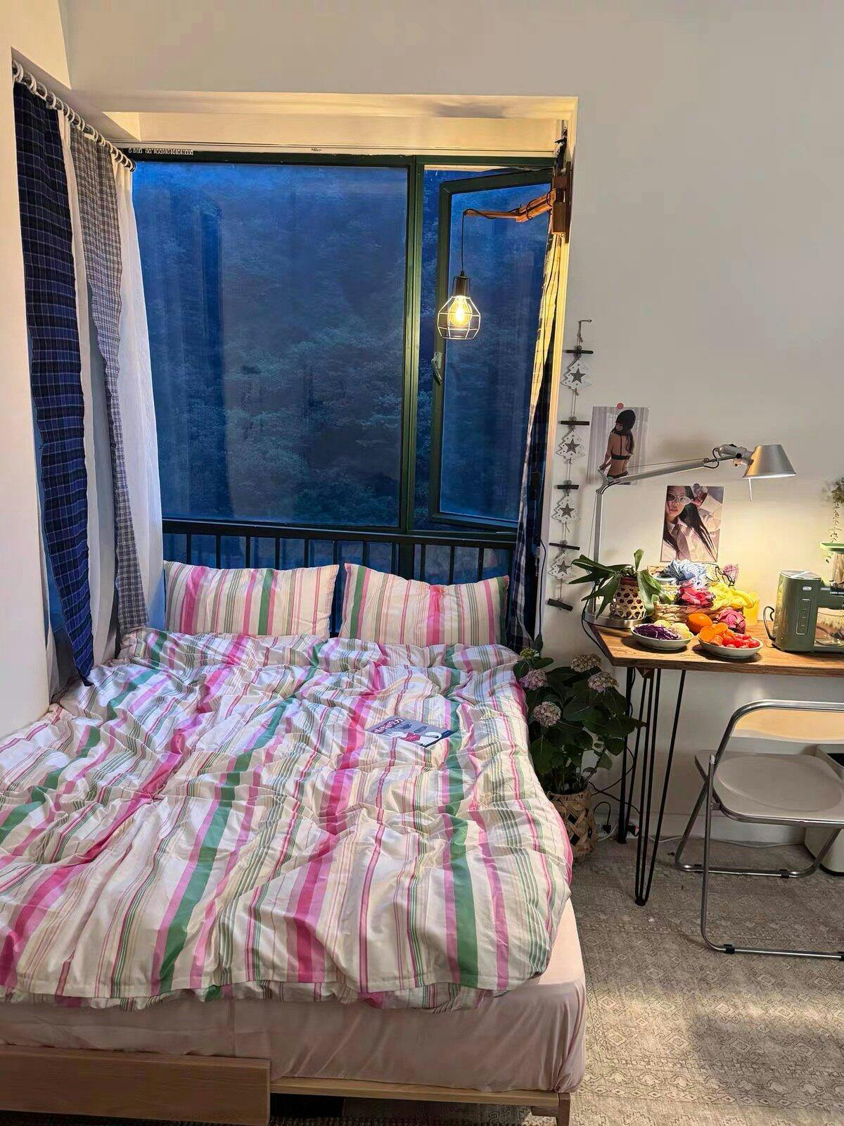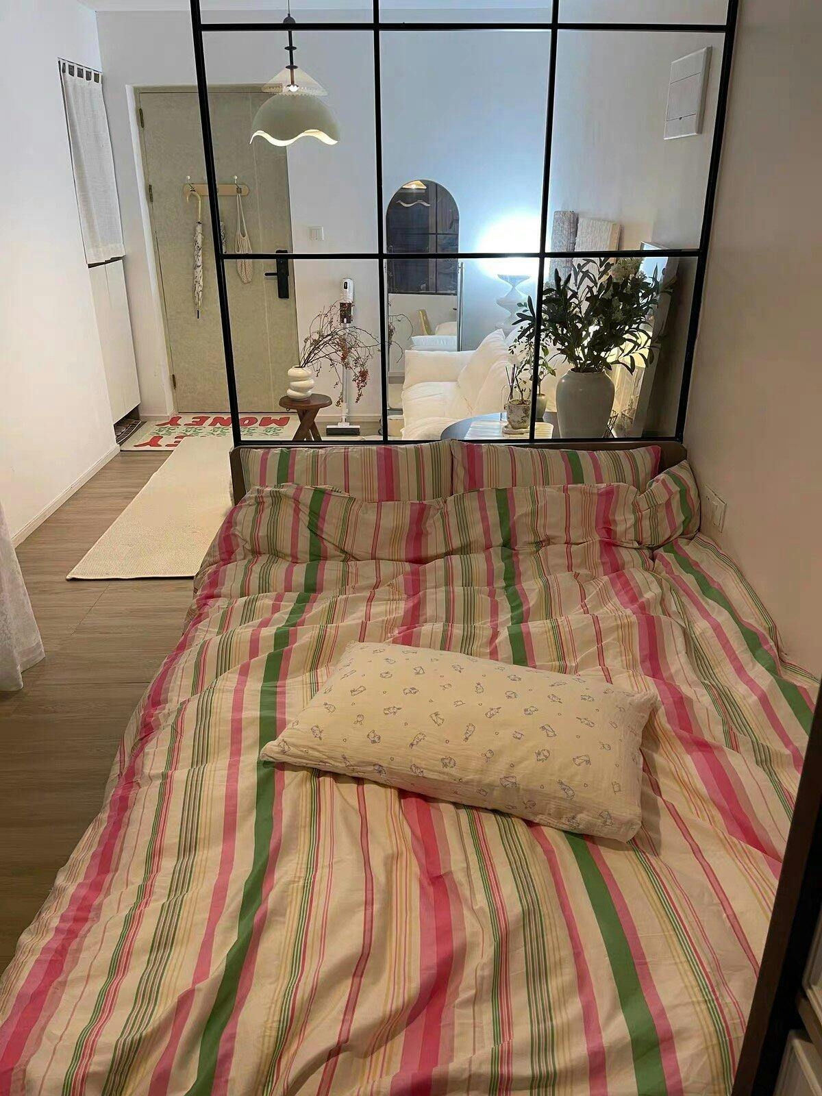 This isn’t a boring neutral set. The pink, green, and soft rainbow stripes add a clean pop of color that reads preppy, retro, and Korean-inspired all at once. Your bed becomes the statement piece, even if the rest of the room is minimal. It photographs beautifully for Pinterest-style room shots.